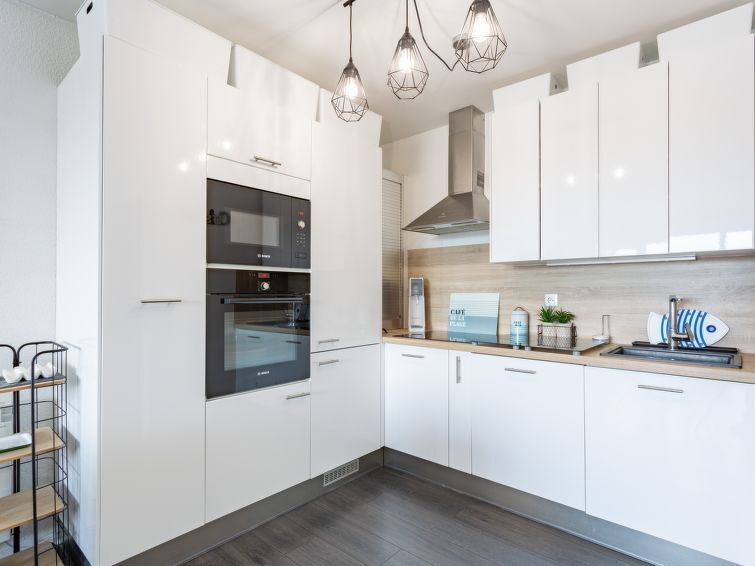 Appartement 3-kamers 70 m2 op de 4e verdieping. Comfortabel en mooi ingericht: woon-/eetkamer met TV (Flatscreen TV). Uitgang naar het terras. 2 kamers, elke kamer heeft 1 2-pers bed (1 x 140 cm, lengte 190 cm). Uitgang naar het balkon. Hal met 1 slaapplaats (80 cm, lengte 190 cm). Open keuken (oven, afwasmachine, 3 keramische glas kookplaten, broodrooster, waterkoker, magnetron, diepvriezer, elektrische koffiemachine). Douche, aparte WC, dubbele wastafels. Elektrische verwarming. Terras 10 m2, overdekt, op het westen gelegen. Terrasmeubelen. Zeer mooi uitzicht op de haven. Ter beschikking: wasmachine, strijkijzer. Internet (Internet (WiFi), gratis). Parkeerplaats. Niet rokers woning. Rookmelders. 400650008929B