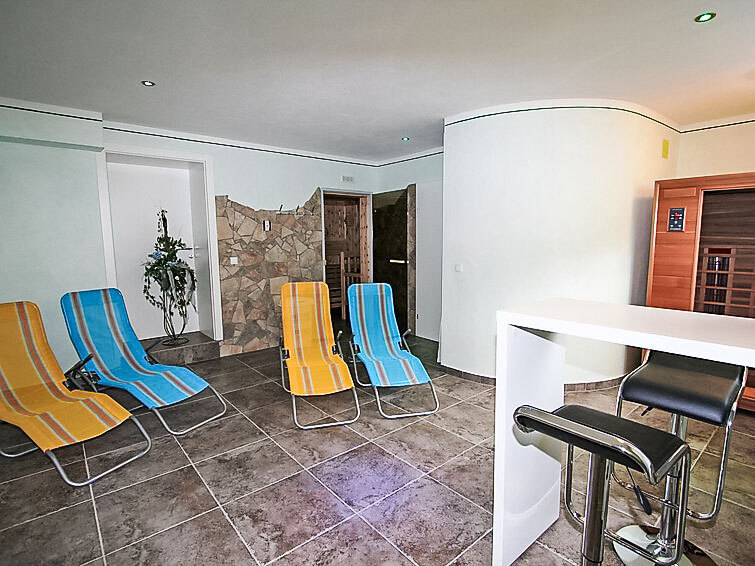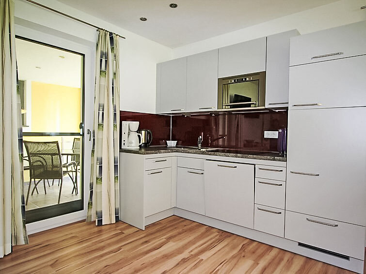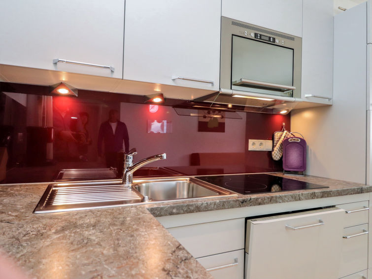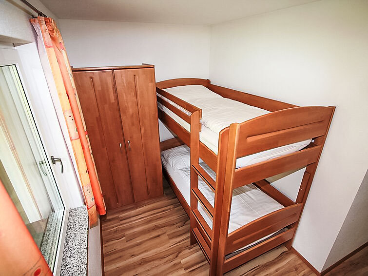 Appartement 3-kamers 68 m2, op de begane grond. Smaakvol ingericht: hal. 1 2-pers. kamer met Kleedkamer met Sat-TV. 1 kleine kamer met 1 x 2 stapelbedden (90 cm, lengte 200 cm). Groot woonkeuken (oven, afwasmachine, 4 keramische glas kookplaten, magnetron, diepvriezer, elektrische koffiemachine) met 1 2-pers divanbed, eethoek en Sat-TV (Flatscreen TV). Uitgang naar het terras. Douche/WC, dubbele wastafels. Terras, zithoek in de tuin. Terrasmeubelen. Uitzicht op het landschap. Ter beschikking: Internet (Internet (WiFi), gratis). Niet rokers woning. Rookmelders, brandblusser. 50416-0022-1417